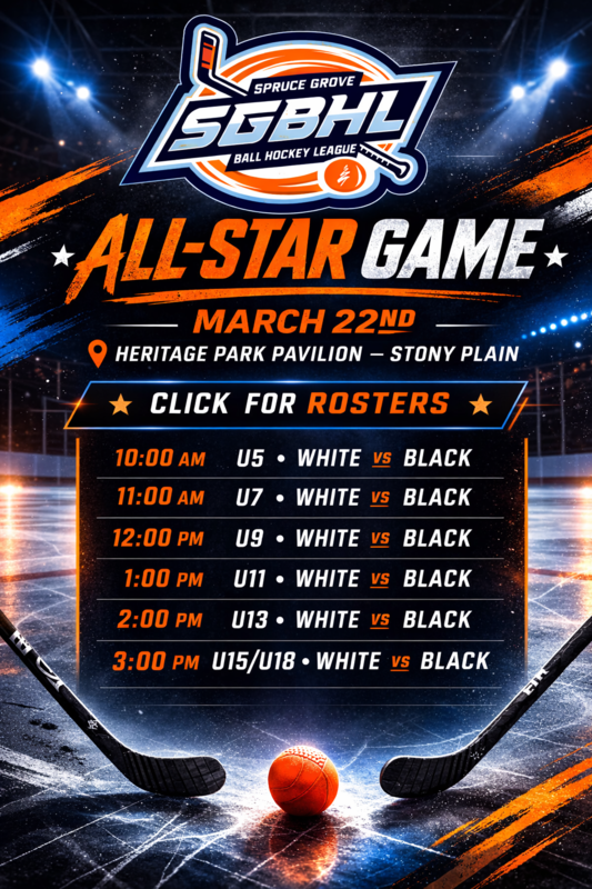 The Spruce Grove Ball Hockey League is active on Twitter, Facebook and Instagram. Be sure to check us out and give us a follow to keep up with news on the fly!
